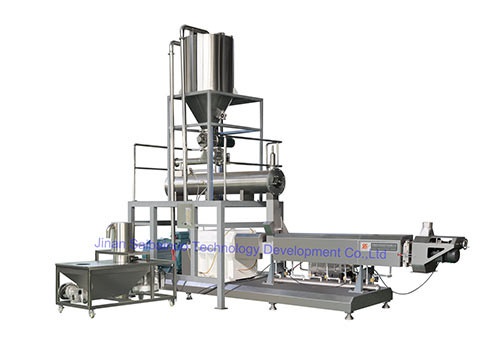 物料在機(jī)筒中經(jīng)過(guò)螺桿的擠壓剪切和混煉,物料在高溫高壓下充分熟化經(jīng)出口模具膨化,形成各種形狀的食品。