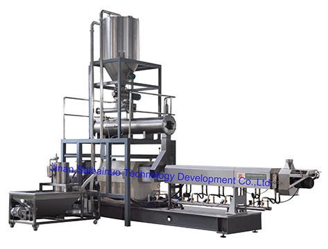 物料在機筒中經(jīng)過螺桿的擠壓剪切和混煉,物料在高溫高壓下充分熟化經(jīng)出口模具膨化,形成各種形狀的食品。